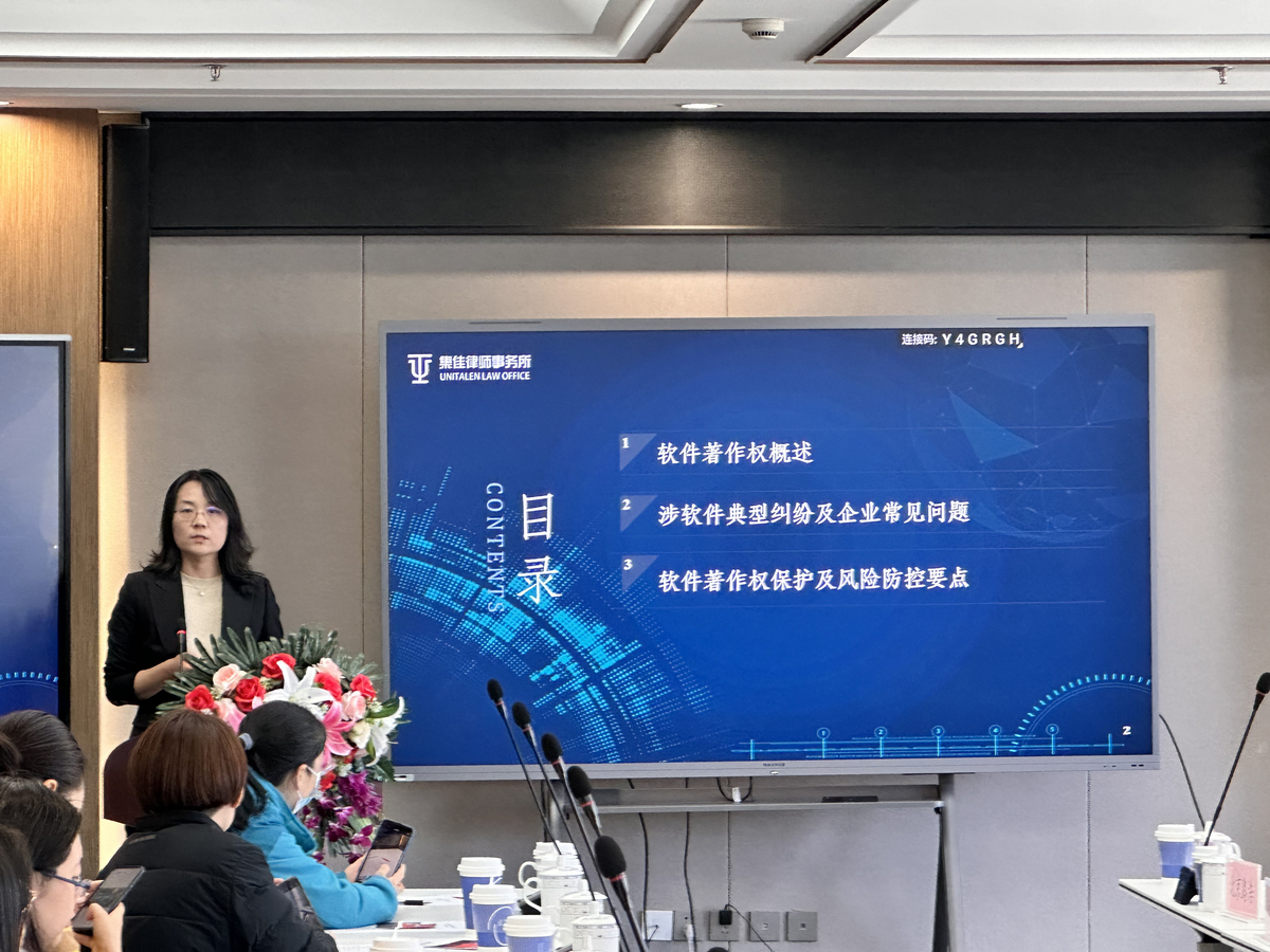 周丹丹律師在簡要介紹軟件著作權(quán)的保護范圍及保護期限、軟件著作權(quán)人享有的基本權(quán)利、常見的軟件著作權(quán)侵權(quán)行為等相關(guān)法律知識的基礎(chǔ)上,結(jié)合多個典型案例,對“員工離職引發(fā)軟件代碼抄襲糾紛”、“盜版軟件/超范圍使用商業(yè)軟件的侵權(quán)糾紛”、“因合同約定不明確引發(fā)的權(quán)屬糾紛或合同糾紛”等常見的軟件著作權(quán)糾紛類型進行詳細解讀,深入分析各類糾紛中反映出的企業(yè)常見問題,進而從軟件著作權(quán)的登記、軟件使用證據(jù)沉淀、軟件開發(fā)合同/合作開發(fā)合同核心條款的擬定、軟件采購、軟件投訴應(yīng)對、軟件源代碼管理等多個角度總結(jié)提煉出軟件著作權(quán)保護及風(fēng)險防控的實務(wù)要點,為與會企業(yè)提供了專業(yè)指引,內(nèi)容豐富詳實,實用性極強。