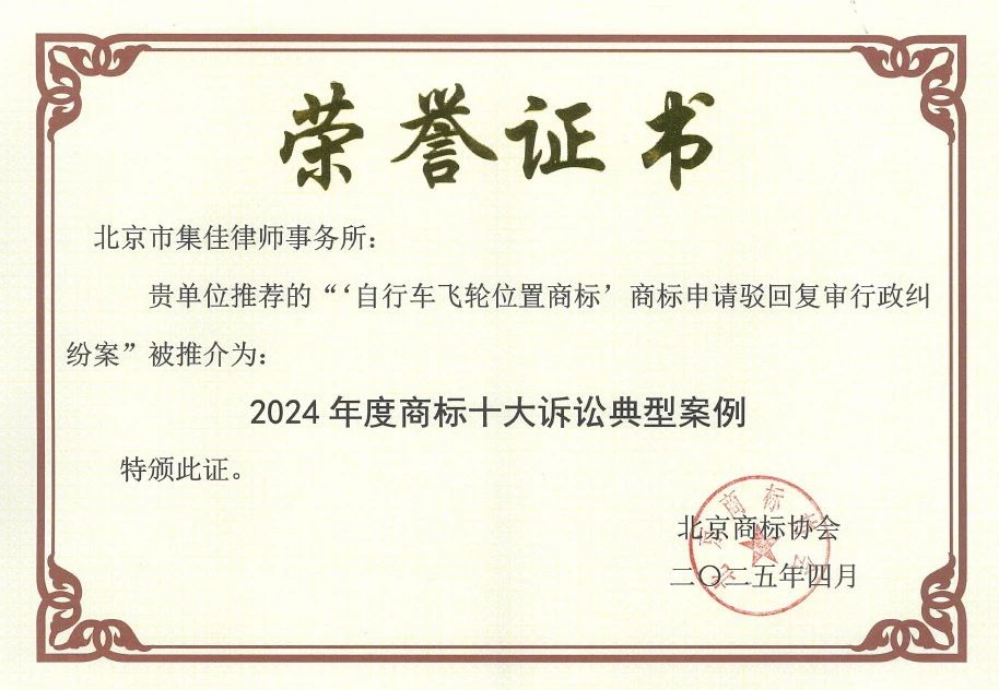 4月27日,北京商標協(xié)會發(fā)布2024年度北京商標十大訴訟典型案例,其中,集佳代理的斯拉姆有限責任公司(SRAM,LLC)訴國家知識產(chǎn)權(quán)局關(guān)于第G1729330號“自行車飛輪位置商標”商標申請駁回復審行政糾紛一案成功入選。